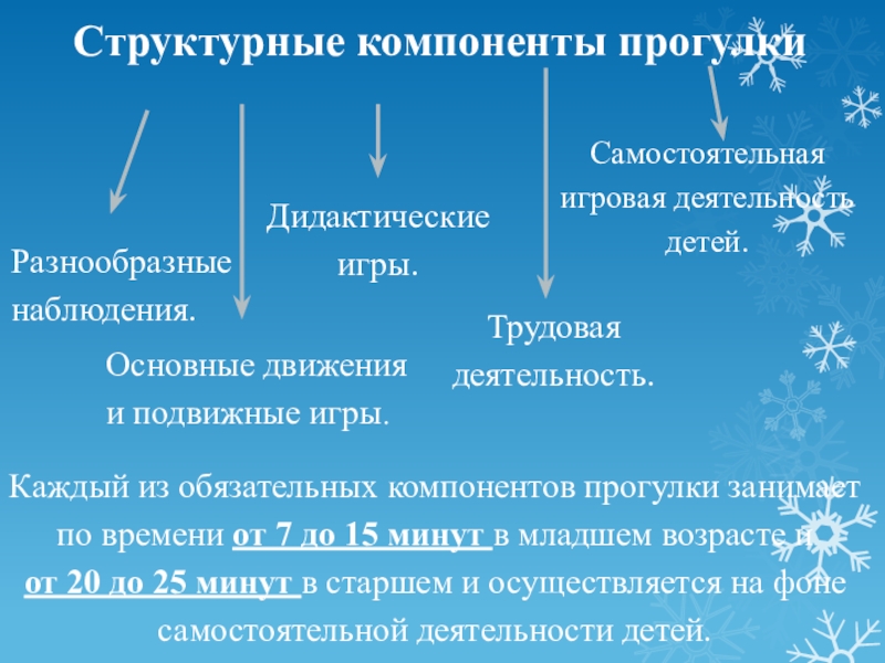 Каждый из обязательных компонентов прогулки занимает по времени от 7 до 15 минут в младшем возрасте и от 20 до 25 минут в старшем и осуществляется на фоне самостоятельной деятельности детей.