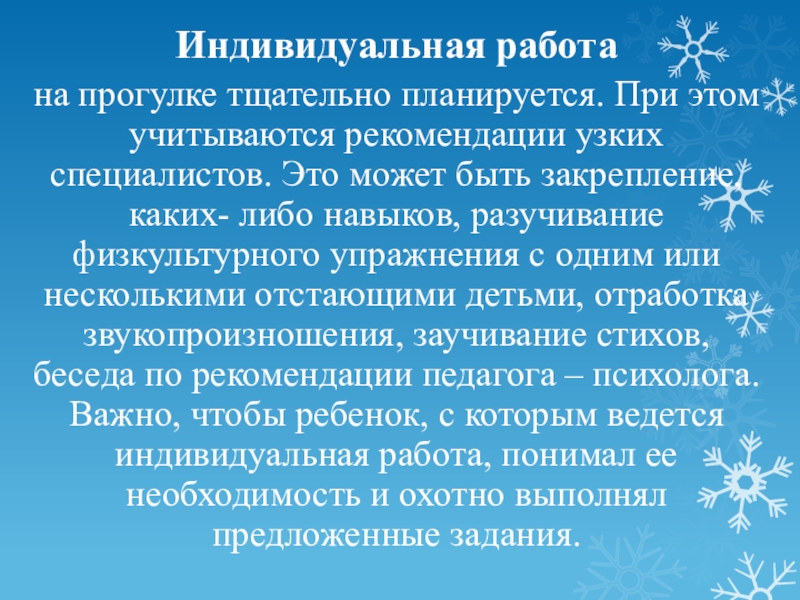 специалистов. Это может быть закрепление, каких- либо навыков, разучивание физкультурного упражнения с одним или несколькими отстающими детьми, отработка звукопроизношения, заучивание стихов, беседа по рекомендации педагога – психолога. Важно, чтобы ребенок, с которым ведется индивидуальная работа, понимал ее необходимость и охотно выполнял предложенные задания.