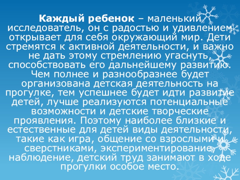 для себя окружающий мир. Дети стремятся к активной деятельности, и важно не дать этому стремлению угаснуть, способствовать его дальнейшему развитию. Чем полнее и разнообразнее будет организована детская деятельность на прогулке, тем успешнее будет идти развитие детей, лучше реализуются потенциальные возможности и детские творческие проявления. Поэтому наиболее близкие и естественные для детей виды деятельности, такие как игра, общение со взрослыми и сверстниками, экспериментирование, наблюдение, детский труд занимают в ходе прогулки особое место.