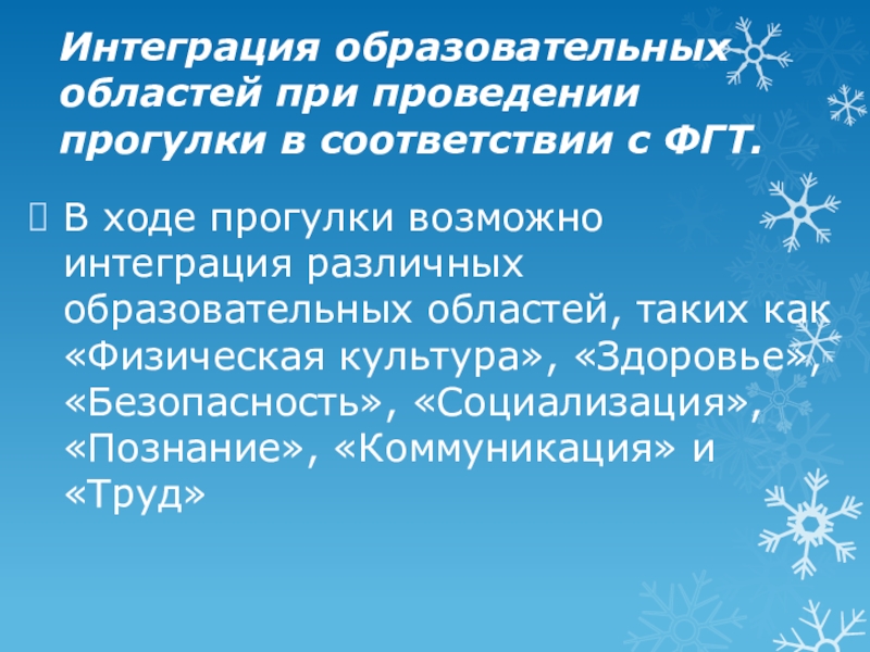 Слайд 6Интеграция образовательных областей при проведении прогулки в соответствии с ФГТ.
