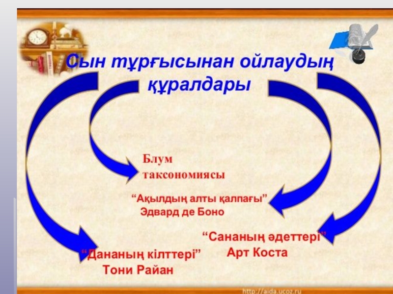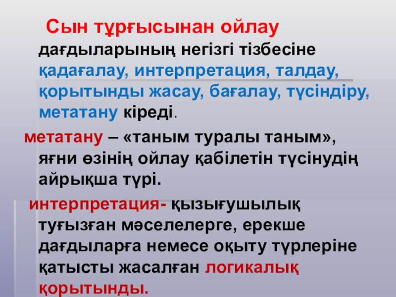 Слайд 9 Сын тұрғысынан ойлау дағдыларының негізгі тізбесіне қадағалау, интерпретация, талдау,қорытынды