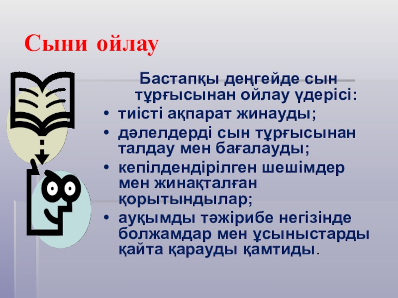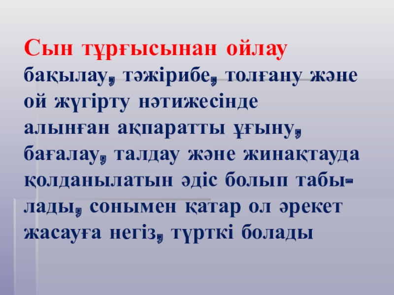 Слайд 8Сын тұрғысынан ойлау бақылау, тәжірибе, толғану және ой жүгірту нәтижесінде