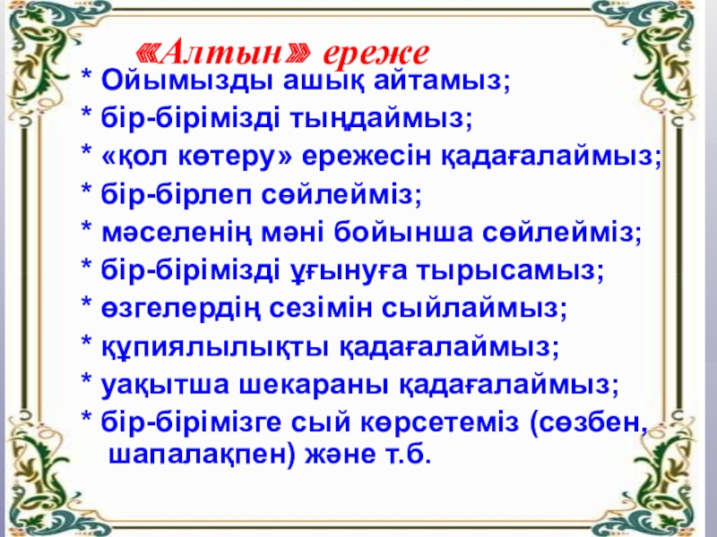 * бір-бірімізге сый көрсетеміз (сөзбен, шапалақпен) және т.б.
