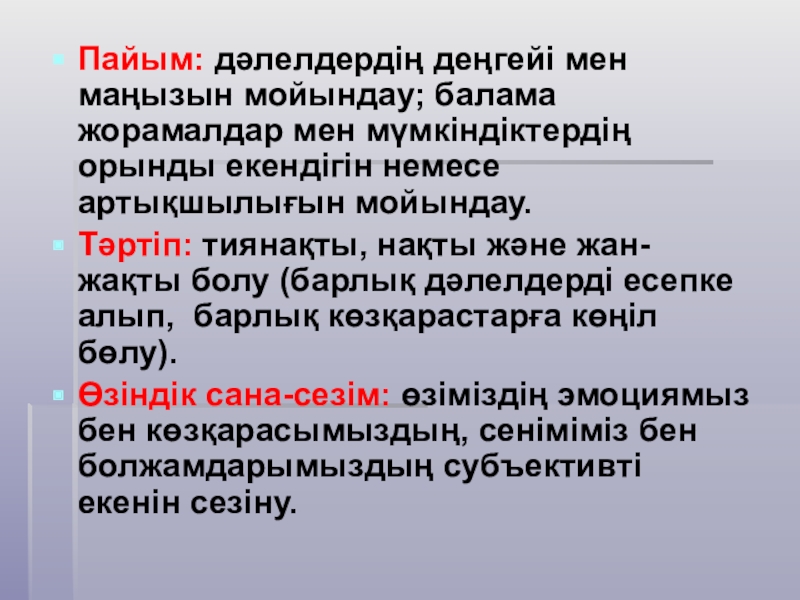 Слайд 14Пайым: дәлелдердің деңгейі мен маңызын мойындау; балама жорамалдар мен мүмкіндіктердің орынды