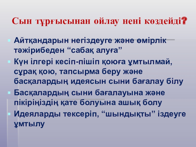 Слайд 12Сын тұрғысынан ойлау нені көздейді?