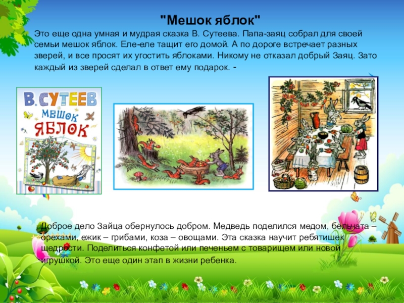 Папа-заяц собрал для своей семьи мешок яблок. Еле-еле тащит его домой. А по дороге встречает разных зверей, и все просят их угостить яблоками. Никому не отказал добрый Заяц. Зато каждый из зверей сделал в ответ ему подарок. -