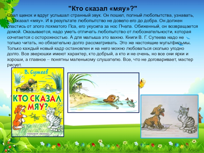 пошел, полный любопытства, узнавать, кто сказал «мяу». И в результате любопытство не довело его до добра. Он должен спастись от злого лохматого Пса, его укусила за нос Пчела. Обиженный, он возвращается домой. Оказывается, надо уметь отличать любопытство от любознательности, которая сочетается с осторожностью. А для малыша это важно. Книги В. Г. Сутеева надо не только читать, но обязательно долго рассматривать. Это же настоящие мультфильмы. Только каждый новый кадр остановлен и на него можно любоваться сколько угодно долго. Все зверюшки имеют характер, кто добрый, а кто и не очень, но все они ярки и хороши, а главное – понятны маленькому слушателю. Все, что не договаривает, мастер рисует.
