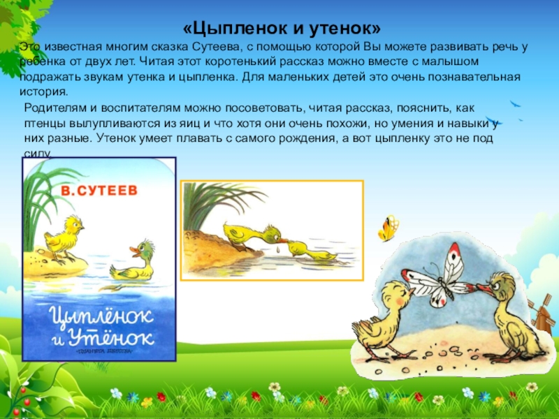 можете развивать речь у ребенка от двух лет. Читая этот коротенький рассказ можно вместе с малышом подражать звукам утенка и цыпленка. Для маленьких детей это очень познавательная история.