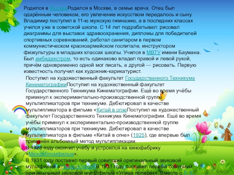 Поступил на художественный факультет Государственного Техникума КинематографииПоступил на художественный факультет Государственного Техникума Кинематографии. Ещё во время учёбы примкнул к экспериментально-производственной группе мультипликаторов при техникуме. Дебютировал в качестве мультипликатора в фильме «Китай в огнеПоступил на художественный факультет Государственного Техникума Кинематографии. Ещё во время учёбы примкнул к экспериментально-производственной группе мультипликаторов при техникуме. Дебютировал в качестве мультипликатора в фильме «Китай в огне» (1925), где впервые был применён альбомный метод мультипликации.