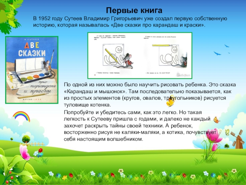 работал в Детгизе. Иллюстрировал множество детских сказок советских писателей: ЧуковскогоС 1947 года работал в Детгизе. Иллюстрировал множество детских сказок советских писателей: Чуковского, МаршакаС 1947 года работал в Детгизе. Иллюстрировал множество детских сказок советских писателей: Чуковского, Маршака, МихалковаС 1947 года работал в Детгизе. Иллюстрировал множество детских сказок советских писателей: Чуковского, Маршака, Михалкова. Впервые с иллюстрациями художника на русском языке вышли книги: Д. РодариС 1947 года работал в Детгизе. Иллюстрировал множество детских сказок советских писателей: Чуковского, Маршака, Михалкова. Впервые с иллюстрациями художника на русском языке вышли книги: Д. Родари «Приключения ЧиполлиноС 1947 года работал в Детгизе. Иллюстрировал множество детских сказок советских писателей: Чуковского, Маршака, Михалкова. Впервые с иллюстрациями художника на русском языке вышли книги: Д. Родари «Приключения Чиполлино» (сутеевские персонажи этой сказки стали образцом для детских игрушек), норвежского писателя А. ПрейсенаС 1947 года работал в Детгизе. Иллюстрировал множество детских сказок советских писателей: Чуковского, Маршака, Михалкова. Впервые с иллюстрациями художника на русском языке вышли книги: Д. Родари «Приключения Чиполлино» (сутеевские персонажи этой сказки стали образцом для детских игрушек), норвежского писателя А. Прейсена «Весёлый Новый год», венгерского писателя Агнеш Балинт «Гном Гномыч и Изюмка», английской писательницы Л. МуурС 1947 года работал в Детгизе. Иллюстрировал множество детских сказок советских писателей: Чуковского, Маршака, Михалкова. Впервые с иллюстрациями художника на русском языке вышли книги: Д. Родари «Приключения Чиполлино» (сутеевские персонажи этой сказки стали образцом для детских игрушек), норвежского писателя А. Прейсена «Весёлый Новый год», венгерского писателя Агнеш Балинт «Гном Гномыч и Изюмка», английской писательницы Л. Муур «Крошка Енот и тот, кто сидит в пруду». А в 1952 годуС 1947 года работал в Детгизе. Иллюстрировал множество детских сказок советских писателей: Чуковского, Маршака, Михалкова. Впервые с иллюстрациями художника на русском языке вышли книги: Д. Родари «Приключения Чиполлино» (сутеевские персонажи этой сказки стали образцом для детских игрушек), норвежского писателя А. Прейсена «Весёлый Новый год», венгерского писателя Агнеш Балинт «Гном Гномыч и Изюмка», английской писательницы Л. Муур «Крошка Енот и тот, кто сидит в пруду». А в 1952 году вышла первая книжка за авторством Сутеева, «Две сказки про карандаш и краски». Чуковский приветствовал её появление рецензией в «Литературной газете».