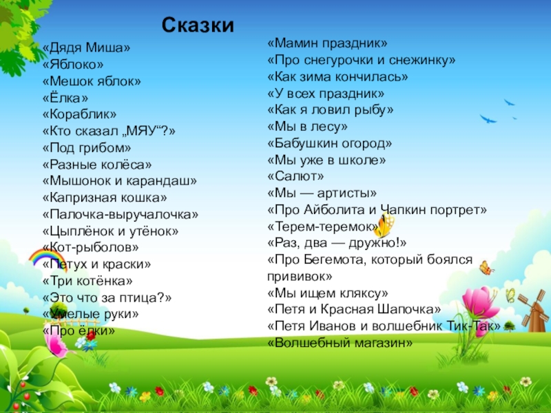 В сказке «Под грибком» все лесные зверьки и насекомые (Муравей, Бабочка, Мышка, Воробей, Зайчик) прячутся от дождика под шляпкой грибка, и всем находится место. Ведь так и должно быть в жизни: никто никого не выгоняет из игры или не сгоняет с занятого места, каждый может слегка потесниться и принять товарища. А это важная мысль для жизни ребенка в коллективе.