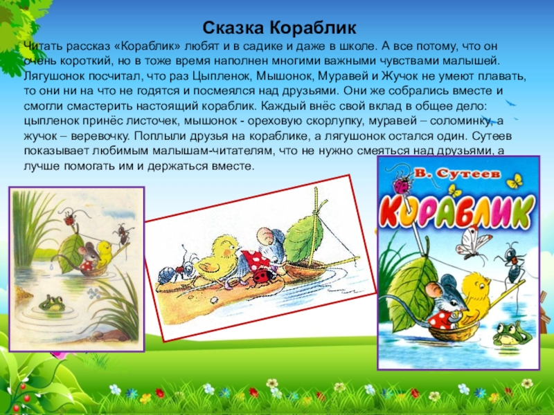 школе. А все потому, что он очень короткий, но в тоже время наполнен многими важными чувствами малышей. Лягушонок посчитал, что раз Цыпленок, Мышонок, Муравей и Жучок не умеют плавать, то они ни на что не годятся и посмеялся над друзьями. Они же собрались вместе и смогли смастерить настоящий кораблик. Каждый внёс свой вклад в общее дело: цыпленок принёс листочек, мышонок - ореховую скорлупку, муравей – соломинку, а жучок – веревочку. Поплыли друзья на кораблике, а лягушонок остался один. Сутеев показывает любимым малышам-читателям, что не нужно смеяться над друзьями, а лучше помогать им и держаться вместе.