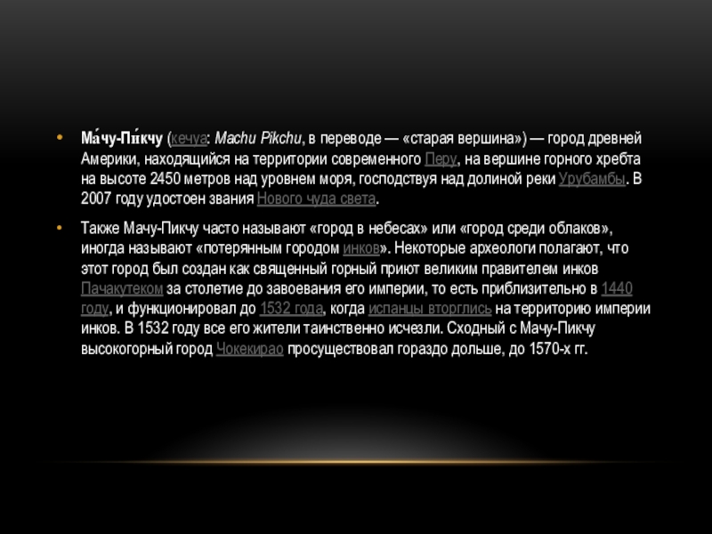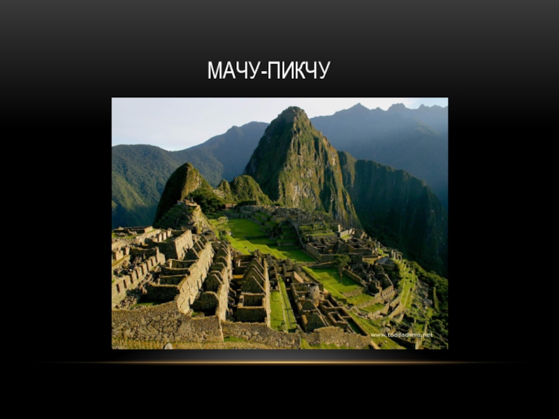 Слайд 8Ма́чу-Пи́кчу (кечуа: Machu Pikchu, в переводе — «старая вершина») — город древней Америки,