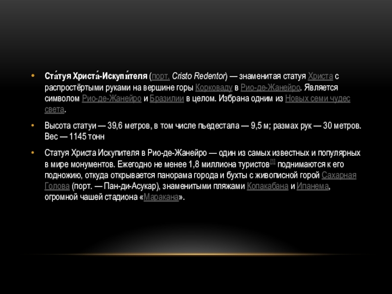 Слайд 14Ста́туя Христа́-Искупи́теля (порт. Cristo Redentor) — знаменитая статуя Христа с распростёртыми руками