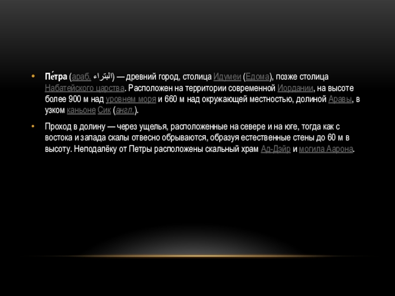 Слайд 10Пе́тра (араб. البتراء) — древний город, столица Идумеи (Едома), позже столица Набатейского