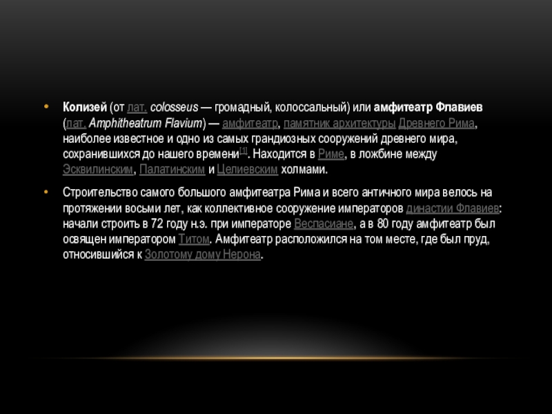 Слайд 6Колизей (от лат. colosseus — громадный, колоссальный) или амфитеатр Флавиев (лат. Amphitheatrum Flavium) — амфитеатр,
