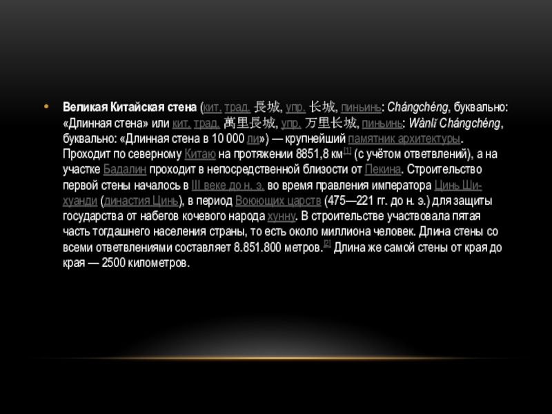 Слайд 4Великая Китайская стена (кит. трад. 長城, упр. 长城, пиньинь: Chángchéng, буквально: