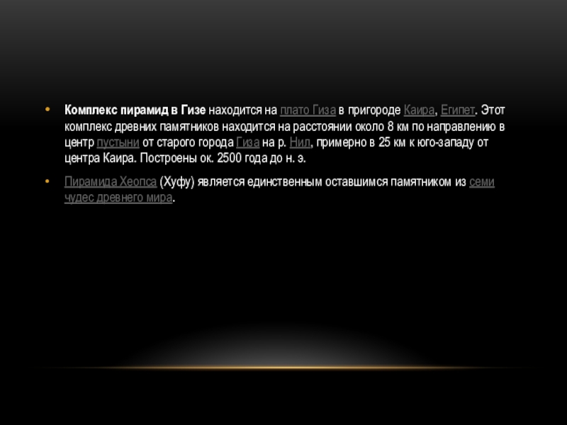 Слайд 19Комплекс пирамид в Гизе находится на плато Гиза в пригороде Каира,