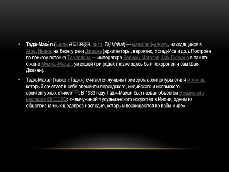 Слайд 12Тадж-Маха́л (хинди ताज महल, англ. Taj Mahal) — мавзолей-мечеть, находящийся в Агре, Индия,