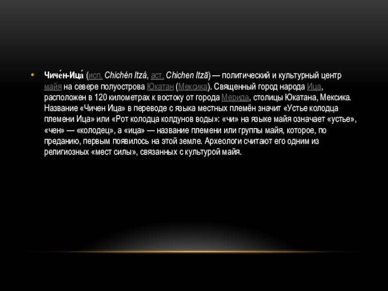 Слайд 16Чиче́н-Ица́ (исп. Chichén Itzá, аст. Chichen Itzā) — политический и культурный центр майя
