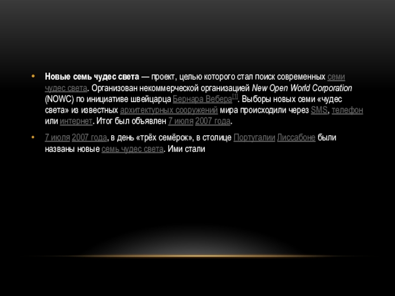 чудес света. Организован некоммерческой организацией New Open World Corporation (NOWC) по инициативе швейцарца Бернара Вебера[1]. Выборы новых семи «чудес света» из известных архитектурных сооружений мира происходили через SMS, телефон или интернет. Итог был объявлен 7 июля 2007 года.