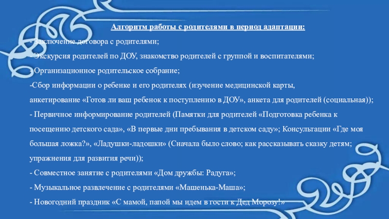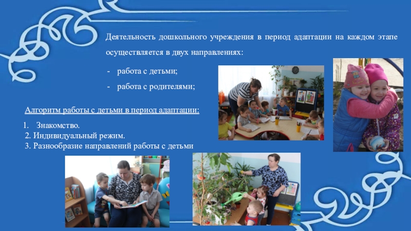 Деятельность дошкольного учреждения в период адаптации на каждом этапе осуществляется в двух направлениях:
