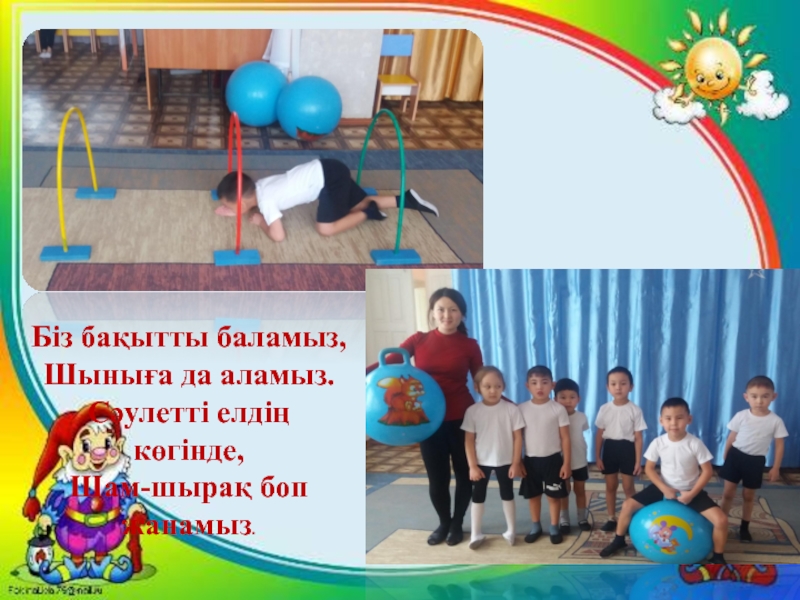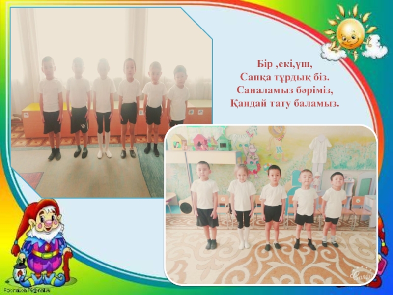 Ойынға қатысамыз,Біз күнде шынығамыз.Көгімде күлсін күнім,Күлейік біз бүгін.