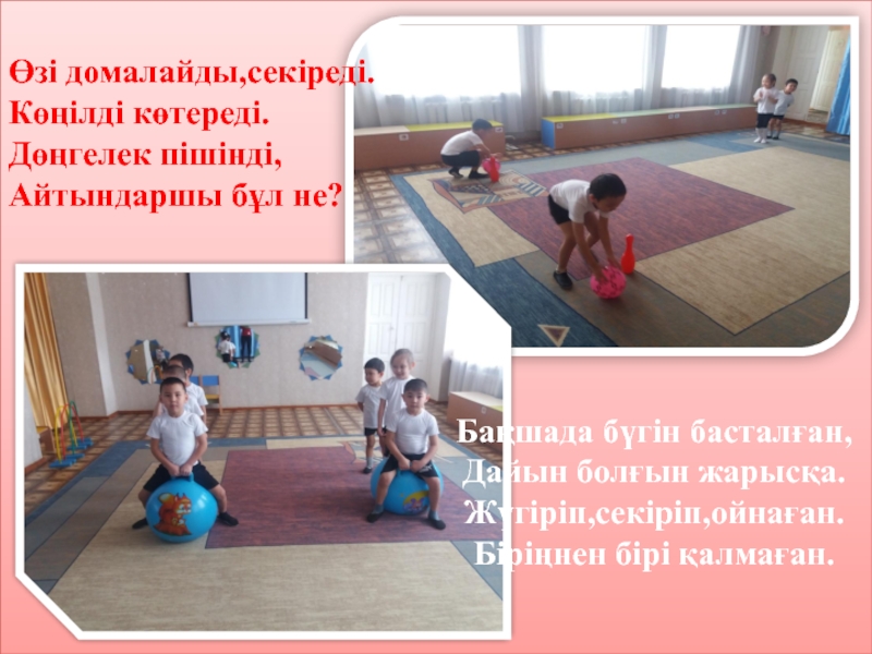 Өзі домалайды,секіреді.Көңілді көтереді.Дөңгелек пішінді,Айтындаршы бұл не?Бақшада бүгін басталған,Дайын болғын жарысқа.Жүгіріп,секіріп,ойнаған.Біріңнен бірі қалмаған.