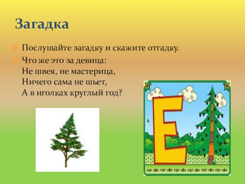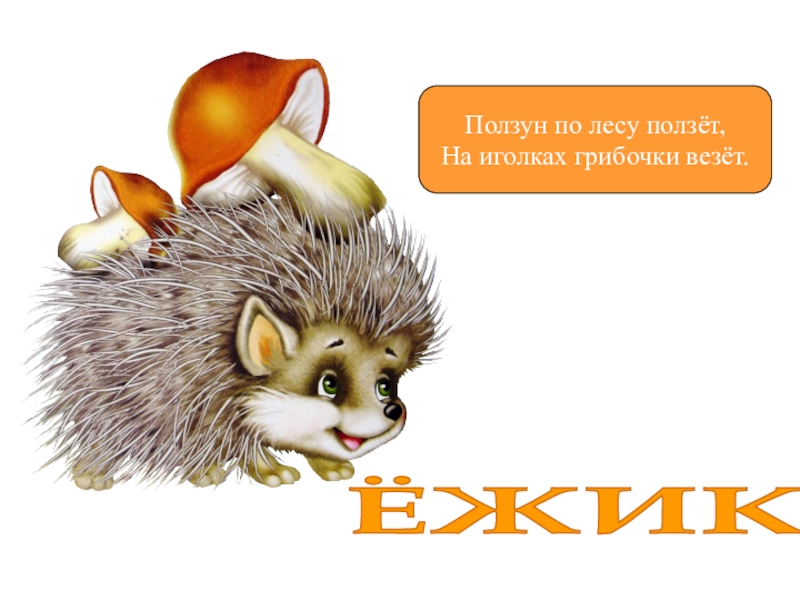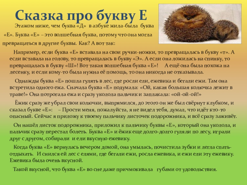Однажды буква «Е» пошла гулять в лес, где росли ели, ежевика и бегали ежи. Там она встретила одного ежа. Сначала буква «Е» подумала: «Ой, какая большая колючка лежит в траве!» Она потрогала ежа и сразу уколола пальчик и заплакала: «ой-ой-ой!»