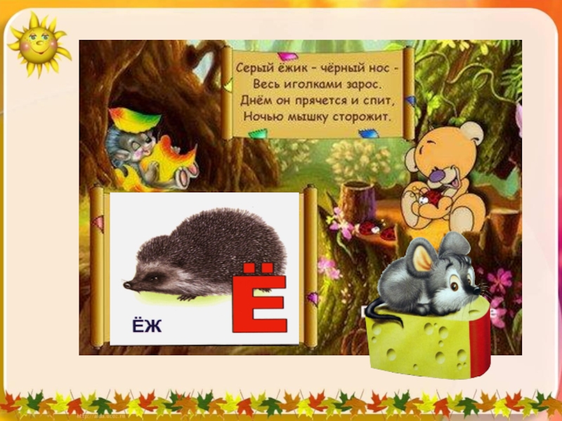 Он нашёл листок подорожника, приложил к пальчику буквы «Е», который она уколола, и пальчик сразу перестал болеть. Буква «Е» и ёжик еще долго-долго гуляли по лесу, играли друг с другом, собирали и ели вкусную ежевику.