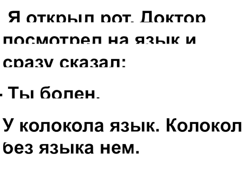 Я открыл рот. Доктор посмотрел на язык и сразу сказал: Ты болен.У колокола язык. Колокол без