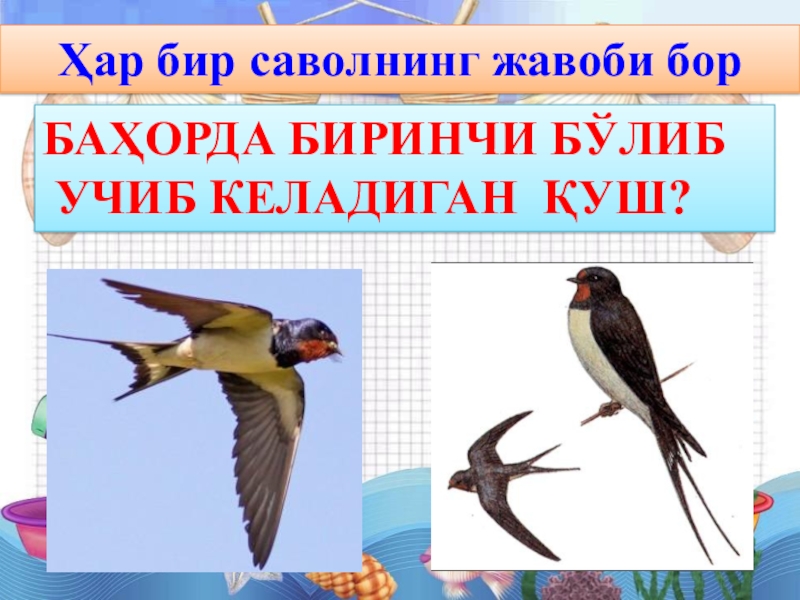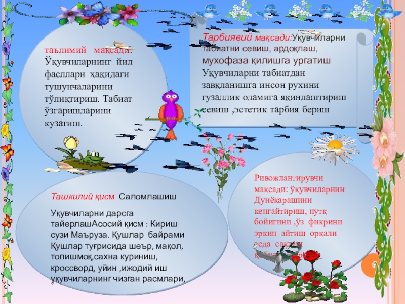 Уқувчиларни дарсга тайерлашАсосий қисм : Кириш сузи Маъруза. Қушлар байрами Қушлар туғрисида шеър, мақол, топишмоқ,сахна куриниш,кроссворд, уйин ,ижодий иш уқувчиларнинг чизган расмлари,