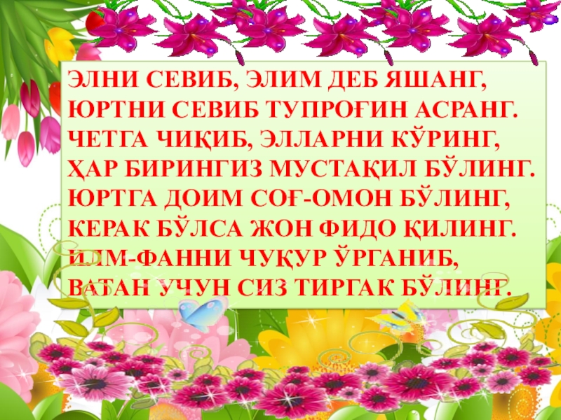 Элни севиб, элим деб яшанг,Юртни севиб тупроғин асранг.Четга чиқиб, элларни кўринг,Ҳар бирингиз мустақил бўлинг.Юртга доим соғ-омон бўлинг,Керак
