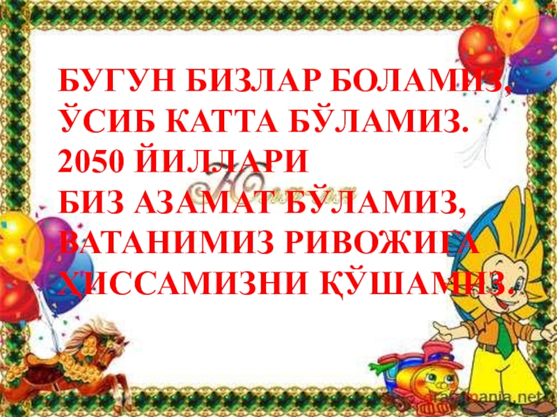 Бугун бизлар боламиз,Ўсиб катта бўламиз.2050 йиллари Биз азамат бўламиз,Ватанимиз ривожигаҲиссамизни қўшамиз.
