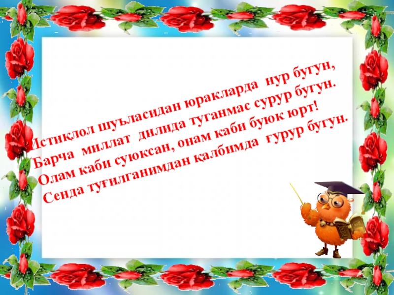 Слайд 2Истиқлол шуъласидан юракларда нур бугун,