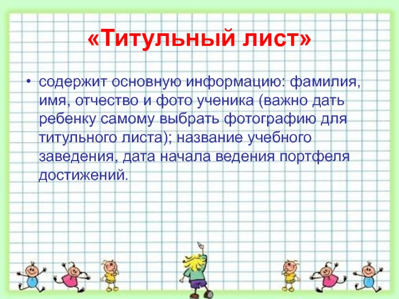 дать ребенку самому выбрать фотографию для титульного листа); название учебного заведения, дата начала ведения портфеля достижений.