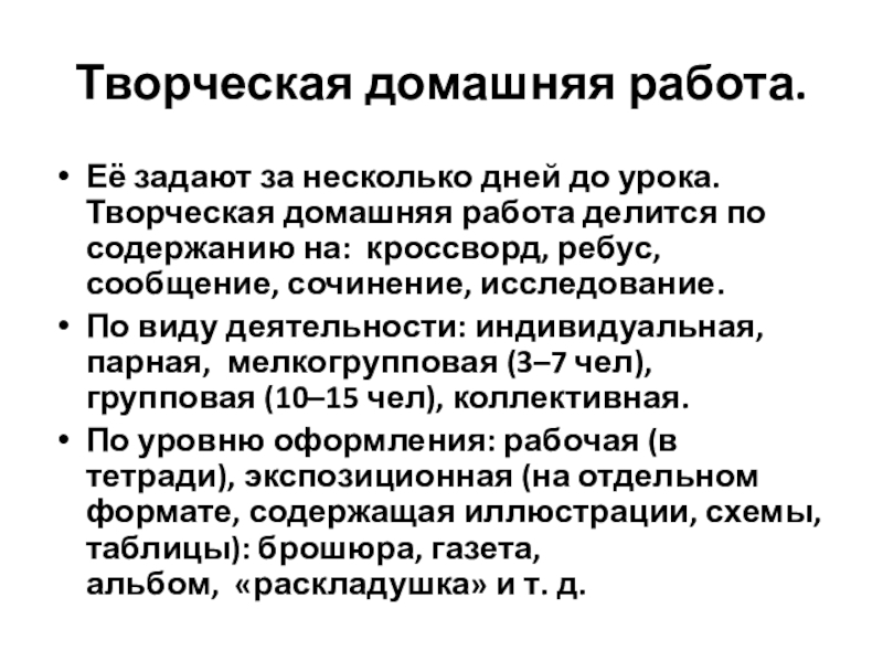 домашняя работа делится по содержанию на: кроссворд, ребус, сообщение, сочинение, исследование.