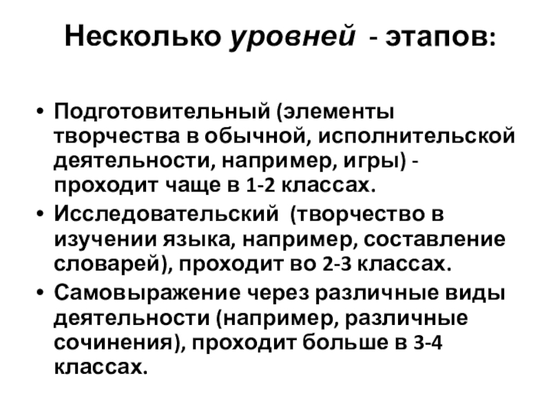 Исследовательский (творчество в изучении языка, например, составление словарей), проходит во 2-3 классах.