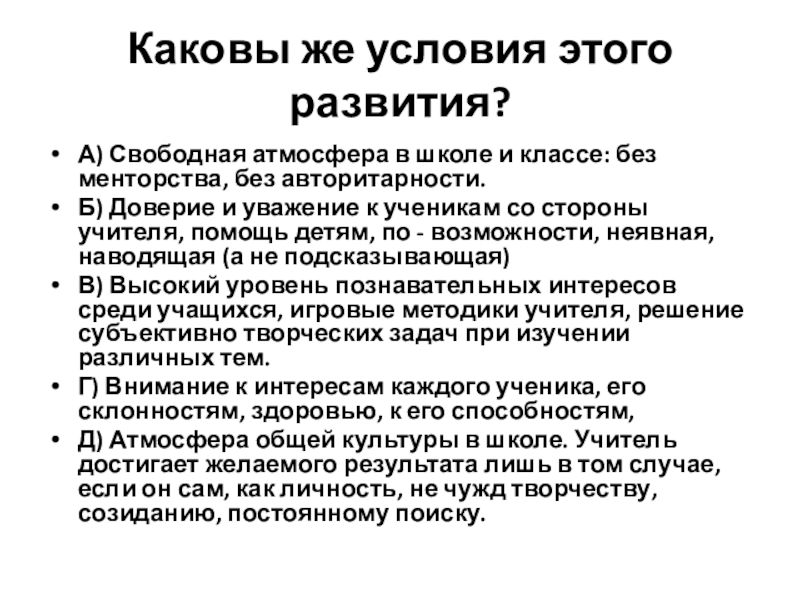 Д) Атмосфера общей культуры в школе. Учитель достигает желаемого результата лишь в том случае, если он сам, как личность, не чужд творчеству, созиданию, постоянному поиску.