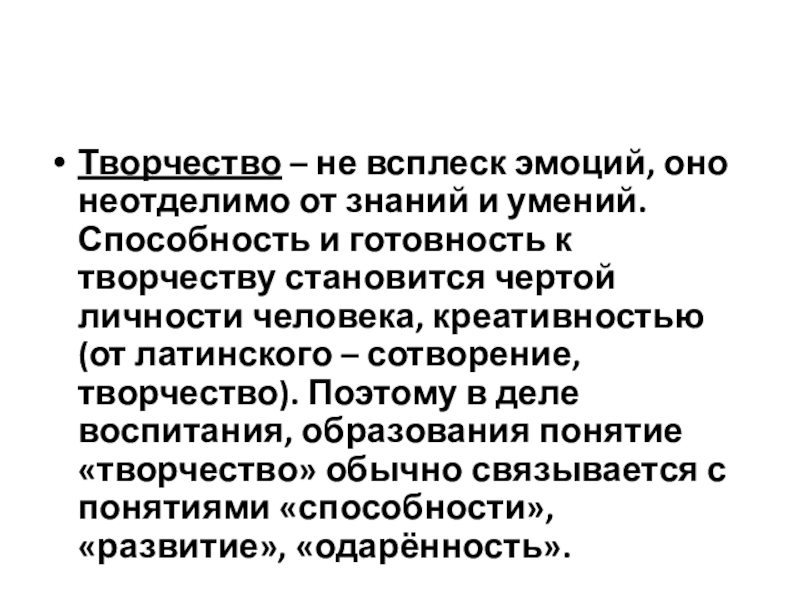 Способность и готовность к творчеству становится чертой личности человека, креативностью (от латинского – сотворение, творчество). Поэтому в деле воспитания, образования понятие «творчество» обычно связывается с понятиями «способности», «развитие», «одарённость».