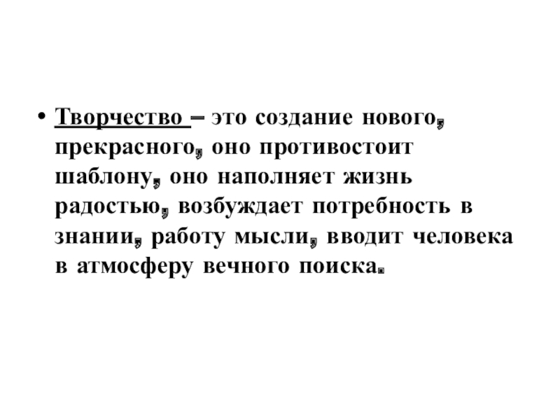 Слайд 5Творчество – это создание нового, прекрасного, оно противостоит шаблону, оно наполняет
