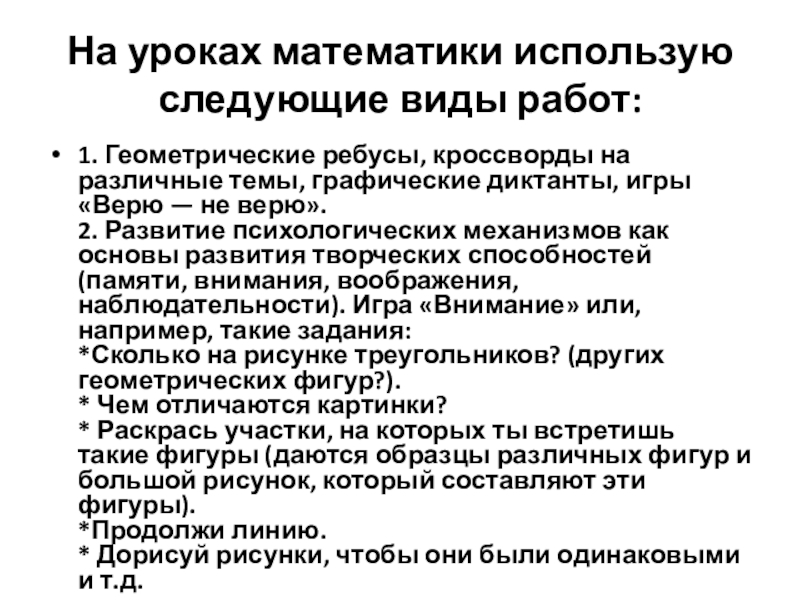 2. Развитие психологических механизмов как основы развития творческих способностей (памяти, внимания, воображения, наблюдательности). Игра «Внимание» или, например, такие задания: