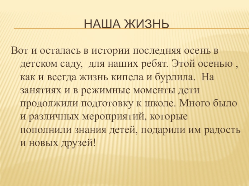 Наша жизньВот и осталась в истории последняя осень в детском саду, для наших ребят. Этой осенью ,