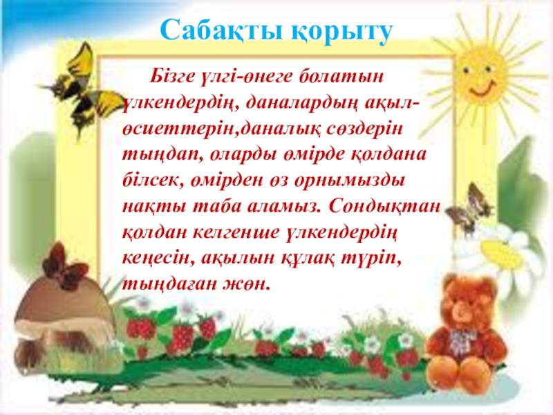 Сабақты қорыту 	Бізге үлгі-өнеге болатын үлкендердің, даналардың ақыл-өсиеттерін,даналық сөздерін тыңдап, оларды өмірде қолдана білсек, өмірден өз орнымызды