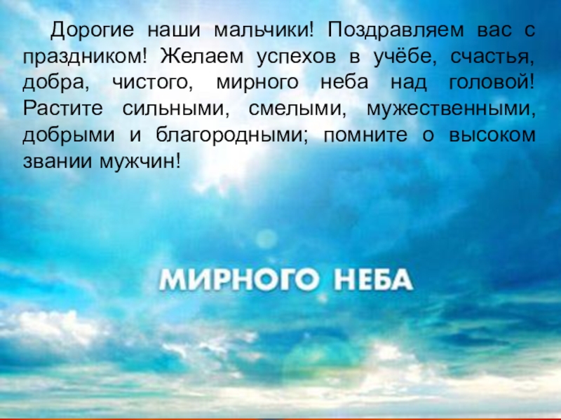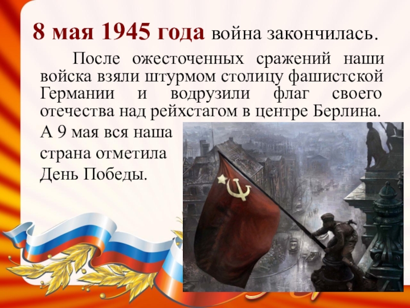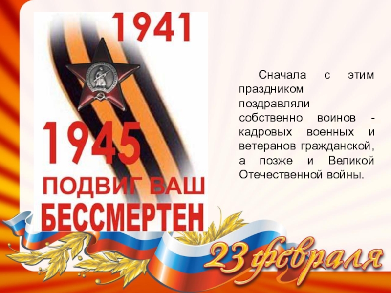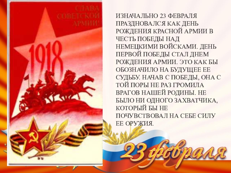 Изначально 23 февраля праздновался как день рождения Красной Армии в честь победы над немецкими войсками. День первой победы стал днем рождения армии. Это как бы обозначило на будущее ее судьбу. Начав с победы, она с той поры не раз громила врагов нашей Родины. Не было ни одного захватчика, который бы не почувствовал на себе силу ее оружия.