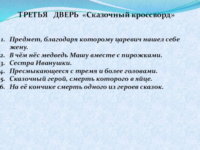 Слайд 11ТРЕТЬЯ ДВЕРЬ «Сказочный кроссворд»