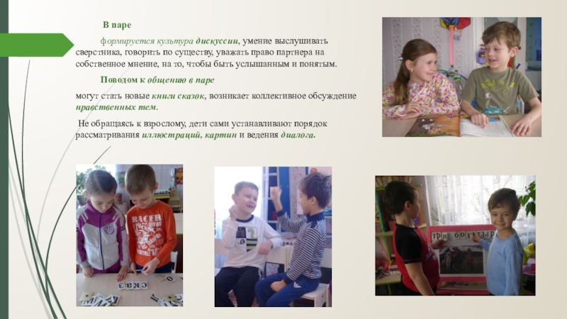 Не обращаясь к взрослому, дети сами устанавливают порядок рассматривания иллюстраций, картин и ведения диалога.