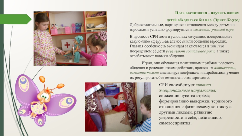 детей обходиться без нас. (Эрнст Легуве) Доброжелательные, партнерские отношения между детьми и взрослыми успешно формируются в сюжетно-ролевой игре.
