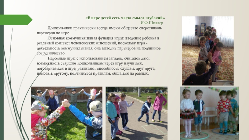 Народные игры с использованием загадок, считалок дают возможность старшим дошкольникам через игру научиться, договариваться в игре, развивают способность слушать друг друга, помогать другому, подчиняться правилам, общаться на равных.