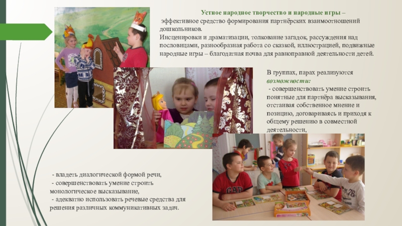 Инсценировки и драматизации, толкование загадок, рассуждения над пословицами, разнообразная работа со сказкой, иллюстрацией, подвижные народные игры – благодатная почва для равноправной деятельности детей.
